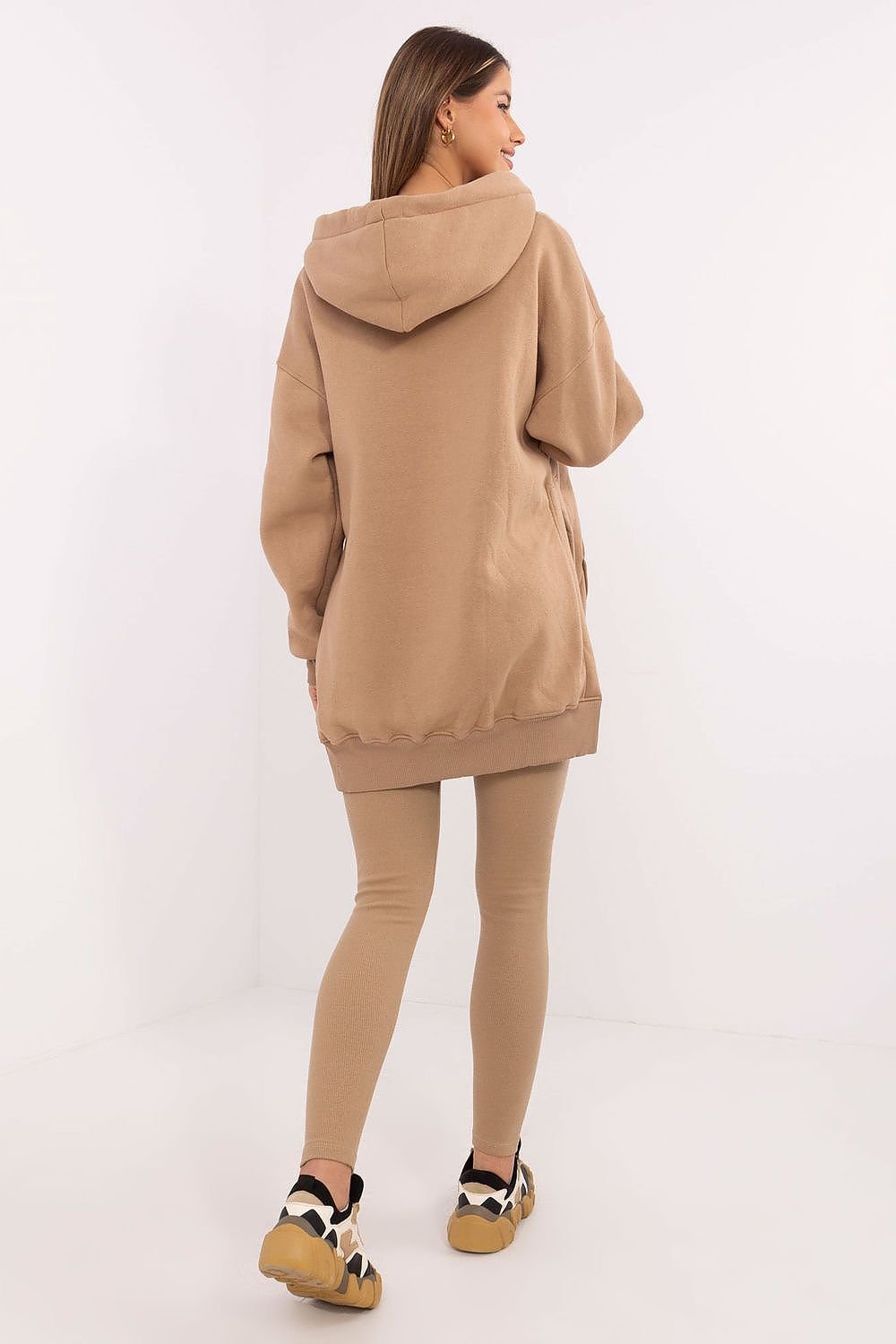 A women's set consisting of a short top, long sweatshirt, and leggings is a combination of comfort and style that will work well in both casual and sporty outfits. Maintained in a casual and sporty character, it is perfect for a walk, workout, or a relaxing day at home. The extended-length sweatshirt is a practical and fashionable element of the set. Made of a warm blend of cotton and polyester, it provides warmth and comfort on cooler days. Equipped with a spacious hood, long sleeves, and a kangaroo pocket, it is not only functional but also stylish. The V-neckline gives it an original look, and the patch on the front adds character. The top with a classic, round neckline is made of cotton with a hint of elastane, guaranteeing comfort and a perfect fit to the body. The shorter length emphasizes the silhouette, perfectly complementing the high-waisted leggings. Leggings with tapered legs and a high waist provide comfort and freedom of movement. Their elastic material, made of cotton with a hint of elastane, fits perfectly to the body. The ribbed structure of the material gives them a unique style, emphasizing the trendy look of the whole set. The smooth pattern of the set creates a cohesive, modern outfit, perfect for active women who appreciate both comfort and fashionable design.