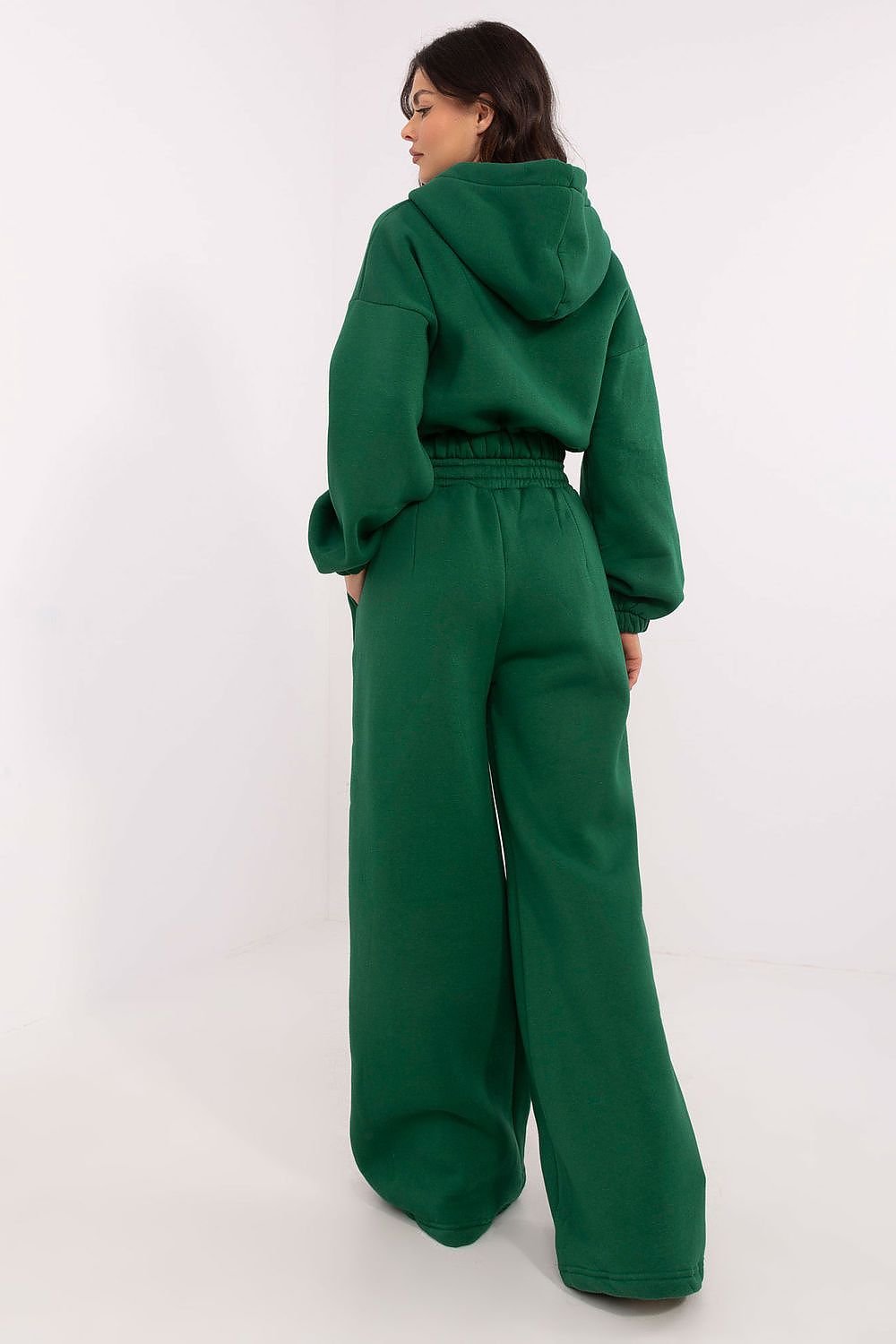 Comfortable and stylish women's tracksuit set is the perfect choice for everyday activities. The set consists of a short hoodie with a loose fit, equipped with a hood and a front zipper reaching to the middle, which ensures practicality and the possibility of styling adjustment. The long-sleeved hoodie provides excellent protection against the cold, and its melange pattern adds a modern character. High-waisted pants with wide legs provide comfort and a fashionable look. The elastic waistband guarantees a perfect fit, and the side slip pockets are a practical solution for small items. The pants are long, making them an ideal choice for cooler days. Made of a soft blend of cotton and polyester, which ensures comfort, durability, and proper thermoregulation. The set is perfect for walks, meetings with friends, or relaxing in the comfort of your own home.