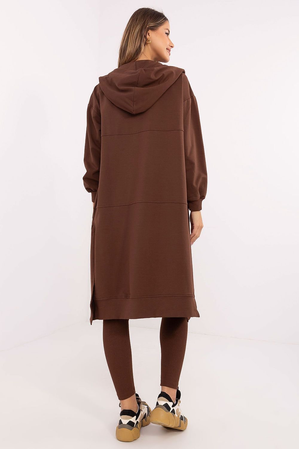 Women's set consisting of a hoodie, top, and leggings is a harmonious combination of casual and sporty style. Designed with daily comfort and activity in mind, it will work great both during training and relaxation. The hoodie with an extended cut is a practical solution for cooler days. Fastened with a zipper and equipped with slip pockets, it provides comfort and functionality. Made of a blend of cotton, polyester, and elastane, it combines softness with elasticity. Long sleeves and a hood additionally protect against wind and cold. The top with a round neckline is simple yet universal, perfectly matched to the entire set. Its composition of cotton and elastane guarantees breathability and comfort. Leggings with tapered legs and a high waistline emphasize the silhouette, while providing full freedom of movement. Made of cotton and elastane, they are characterized by elasticity and durability. An additional feature is the ribbed structure of the material, which gives them a unique character. The smooth pattern of the whole set fits perfectly into a daily, sporty look, offering both style and maximum comfort of use.